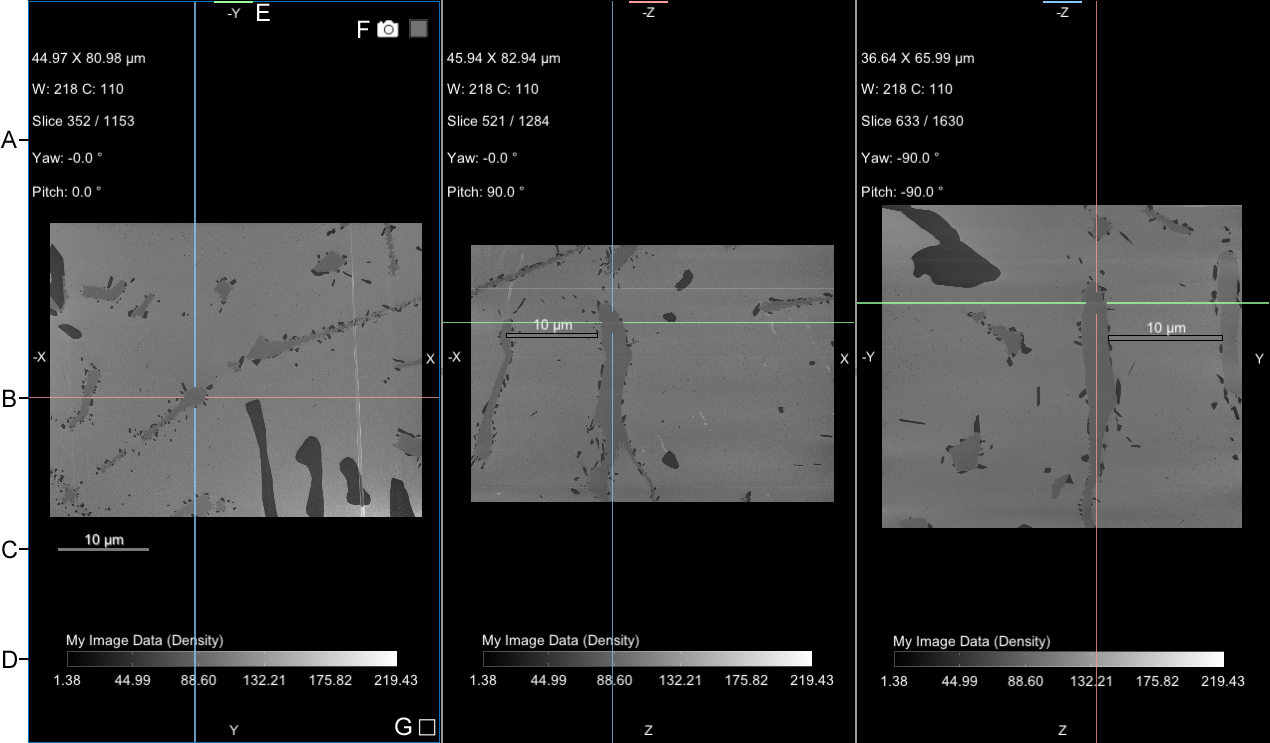 A. Text annotations B. 3D Cursor C. Scale bar D. Legends E. Orientation indicators and axis colors F. Active view icons G. Marked slices indicator