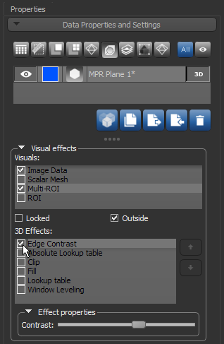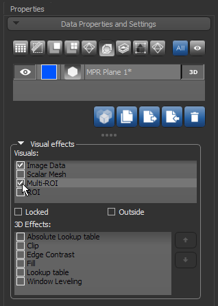 The options in the Plane settings box on the Data Properties and Settings panel let you choose an initial orientation for the selected plane or to bind a plane with a selected 2D view. You can also choose to show corresponding 2D data in the scene’s 3D view. As is the case for all other shapes, you can choose the additional visual effects you want to apply to the selected plane in the Visual effects box (see Shape Properties and Settings).