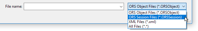 ORS Session files (*.ORSSession) are self-contained binary files. Datasets and objects included in a session are saved within the session file itself. A distinct advantage of this arrangement is that session files do not just reference datasets and objects and can therefore be shared easily. However, a disadvantage of this arrangement is that session files, by nature, include duplicated data and can be very large.
