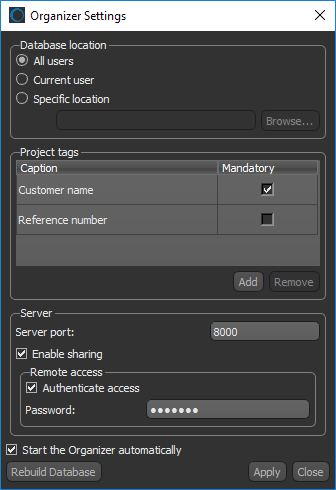 The Organizer settings, which let you choose a database location, add mandatory project tags, and enable sharing, are available in the Organizer Settings dialog, shown below.