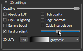 Image data that is imported or created appears on a separate line in the top section of the Data Properties and Settings panel. You can control the visibility of datasets within a scene with the icons available in the top section of the panel, as well as access basic information about the dataset and additional settings in the lower section. A pop-up menu is available that provides access to tools for modifying datasets and other functions (see Image Data Pop-Up Menu).