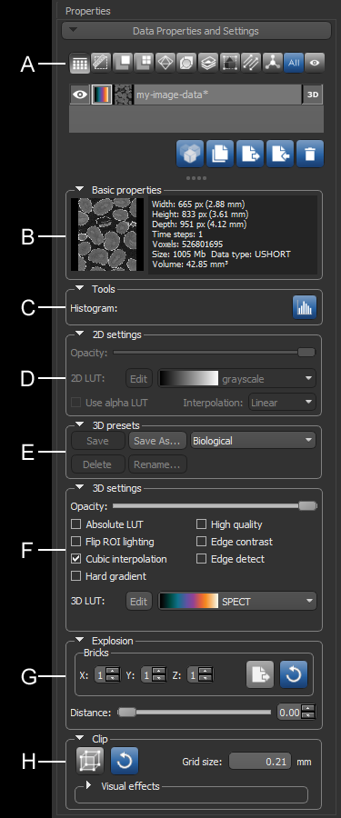 A. Dataset list B. Basic properties C. Tools D. 2D settings E. 3D presets F. 3D settings G. Explosion panel H. Clip panel