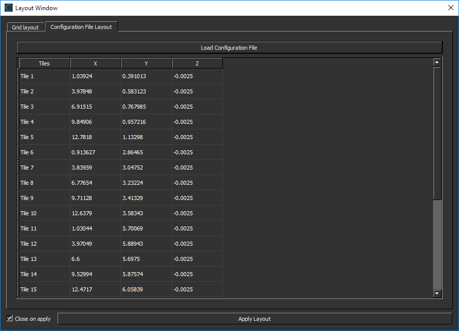 If available, you can load configuration files that contain the coordinates of each image tile in a dataset. Configuration files can be saved from the results of stitching in Dragonfly, or you can create your own configuration files in the TXT file format that contain the native positions of the tiles acquired by the microscope. If a configuration file is not available for your data, you will need manually select a grid layout (see Choosing Image Grid Layouts).