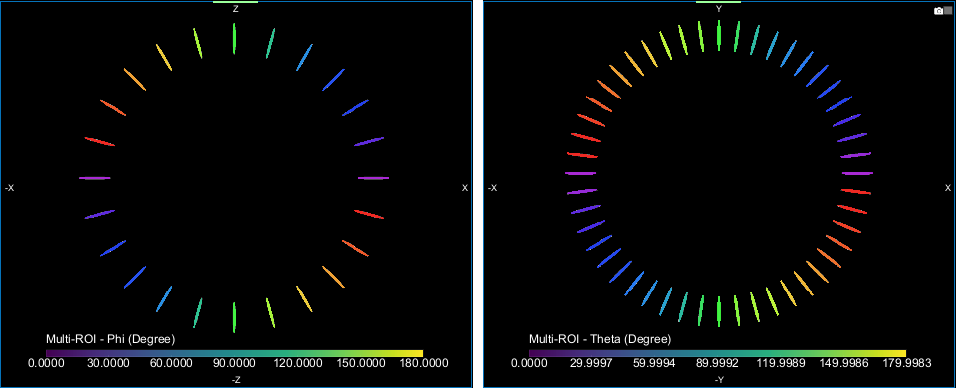 In Object Analysis, Phi and Theta describe the orientation of the longest axis (shortest eigenvalue of the tensor of inertia) of an object in the local orientation system of the analyzed multi-ROI. The value of Phi is the angle from the X axis of the projection on the XZ plane of the orientation, while the value of Theta is the angle from the X axis of the projection on the XY plane of the orientation. Phi (left) and Theta (right) angles NOTE These angles describe an orientation, not a vector. This is why the values are in the range of 0 to 180°. |