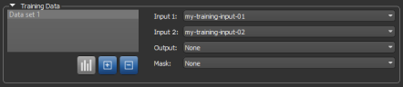 Lists all of the selected training sets, which include inputs, outputs, and masks. Options in the Training Data list include the following: Show Training Data Statistics… Click the Show Statistics Note This option is NOT available for regression models. Add New Training Dataset… Click the Add New Remove New Training Dataset… Click the Remove |