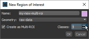 Before you use a manual segmentation tool, you must first create an empty multi-ROI. Shapes for the new object can either be taken from the dataset you intend to segment, or from another dataset, region of interest, or multi-ROI. You can also choose the number of classes for the new multi-ROI.