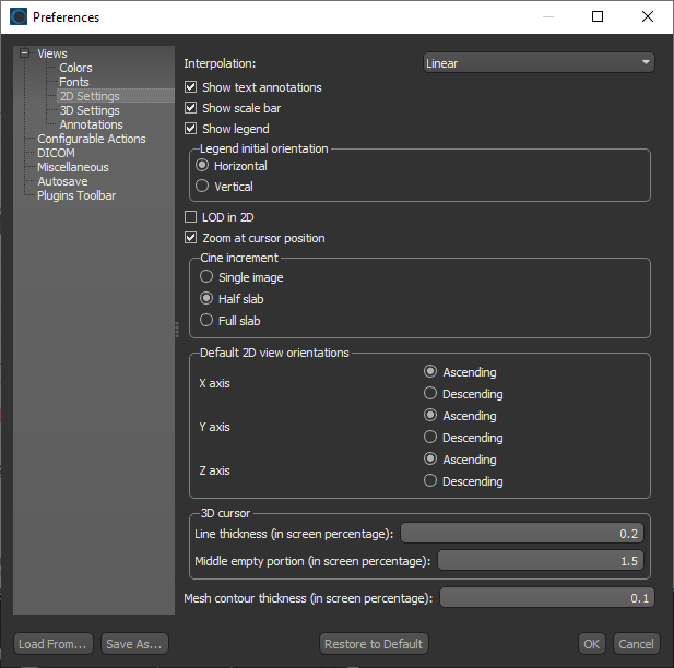Determines the interpolation applied to images in 2D views. Nearest… Is the most basic interpolation scheme and only considers one pixel when filtering. Linear… Considers the closest 2x2 neighborhood and then takes a weighted average of these 4 pixels to arrive at its final interpolated value. Will result in smoother looking images than Nearest. |