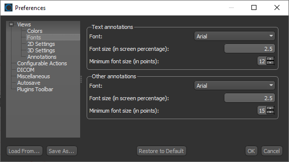 The Fonts preferences determine the appearance of text annotations and text associated with measurements and other annotations. Choose Views | Fonts in the Preferences dialog to view the Fonts preferences, shown below.