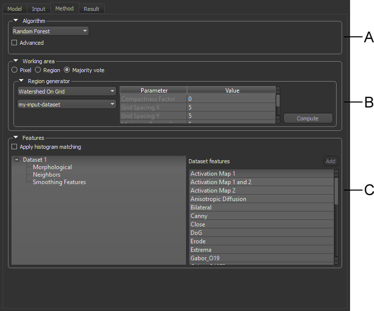 The Method panel includes the classifier engine and its parameters, the working area, which determines whether the classifier is trained on pixels only or the pixels within region features, as well as the features that will be extracted from the input dataset(s) to train the classifier.
