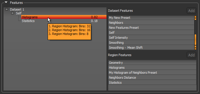 Datasets added to the Input Panel are automatically added to the features tree since they are the base to which dataset or region features presets can be added. Each feature preset added to the tree gives more information to the trainer. After training, the relevance of each feature preset, on a scale from 0 to 1, is displayed in the tree to help you judge whether the feature preset provides useful information to the classifier or not. Features determined to be ineffective can be removed from the features tree.