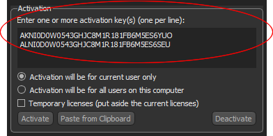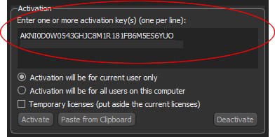 - Enter or paste the activation key(s) you received in the Activation box, circled below.
