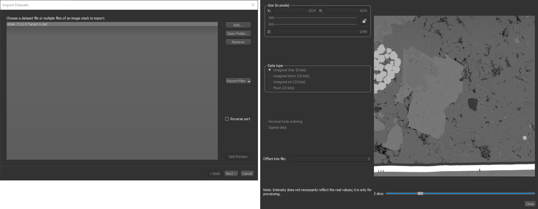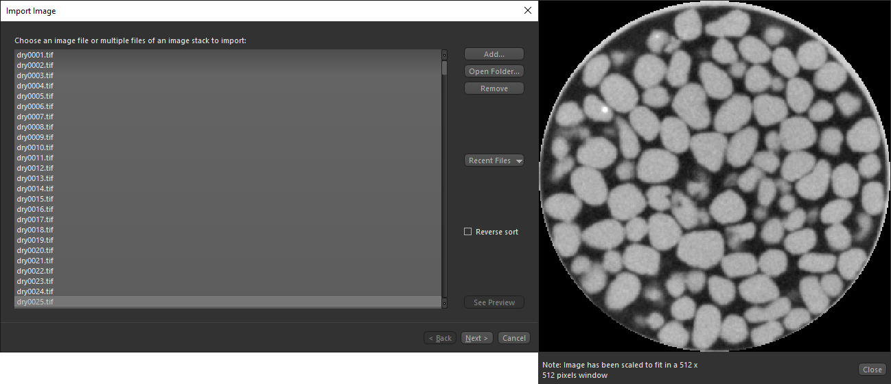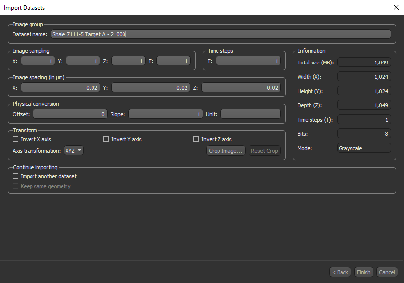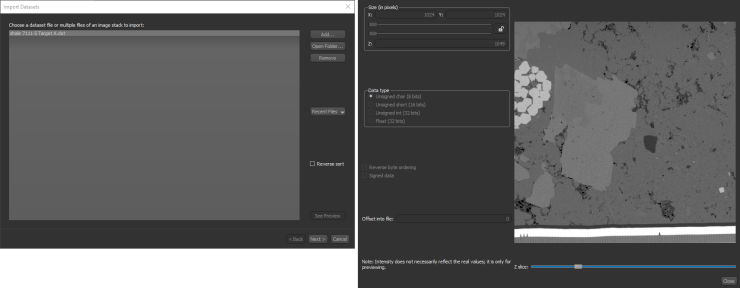 Dragonfly's Image Loader works like a wizard, in which a succession of screens — Import Image and Image Settings — are presented to help you navigate the process of importing image files. In addition, two optional dialogs — Preview and Crop the Image — are available to preview datasets and to select cropping settings. You should note that data can be imported from local and network drives or from storage devices such as CDs, DVDs, and USB keys (see Supported File Formats).