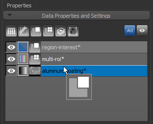 The Properties tab on the right sidebar of the Dragonfly workspace is the default location for the Data Properties and Settings panel, which lists the datasets and objects that can be shown in the scene views. For the selected object in the top section of the panel, the lower section shows related information, settings, and tools. Pop-up menus are also available that provide access to common operations, as well as to advanced features and tools.