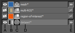 You can control the visibility of datasets and other objects within a scene, as well as choose colors or LUTs for images, annotations, regions of interest, and other objects, with the icons and buttons available in the object list. You can also filter the listed items, as well as copy, import, and export objects.