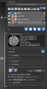 The Properties tab on the right sidebar of the Dragonfly workspace is the default location for the Data Properties and Settings panel, which lists the datasets and objects that can be shown in the scene views. For the selected object in the top section of the panel, the lower section shows related information, settings, and tools. Pop-up menus are also available that provide access to common operations, as well as to advanced features and tools.