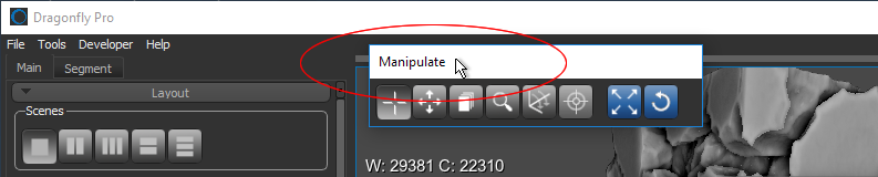 A workspace is a particular layout of the tools and properties panels, which is remembered on exit and restored at startup. Once a useful layout of the available panels is chosen, Dragonfly will always look the same.