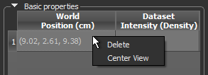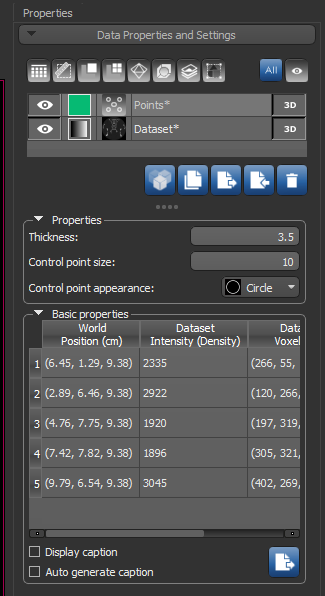 Information provided for each point within a set includes its position in the world coordinate system, as well as its intensity and voxel position. For fused datasets, each corresponding intensity value and voxel position are also available. You can add captions to each point within a set to annotate your findings. Additional options for Points — such as Export, Copy, and Look at Annotation — are available in the pop-up menu (see Annotation Pop-Up Menu).