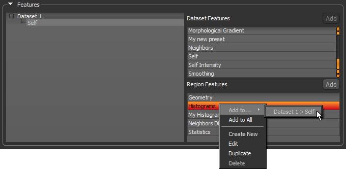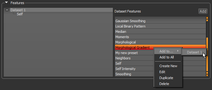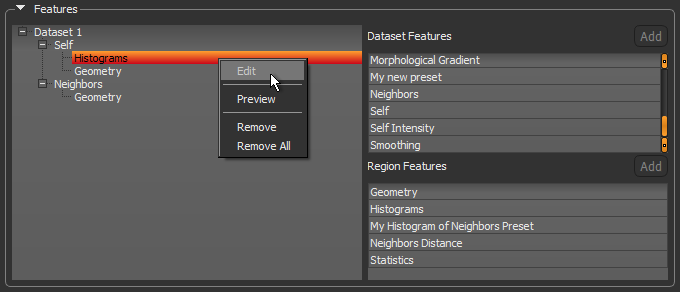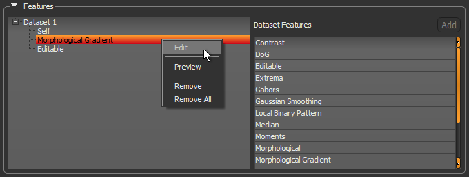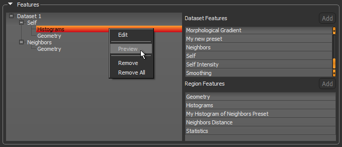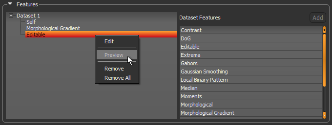To preview a dataset feature, right-click the feature preset and then choose Preview in the pop-up menu.