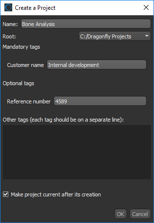 In some cases, you may want to make specific project tags a mandatory or optional requirement when creating a new project. Whenever you add this requirement, the mandatory and optional tags will appear in the Create a Project dialog as shown below.