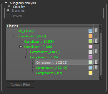 Determines how colors are applied to the objects in the multi-ROI in the scene views and in the Histogram view. You should note that Subgroup must be selected in the Color by box at the top of the panel to access the following settings. Branches… If selected, the colors of the branches (classes) will be applied. Leaves… If selected, the colors of the leaves (sub-classes) will be applied. |
