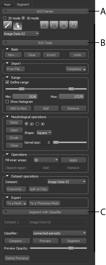 A. ROI Painter panel B. ROI Tools panel C. Segment with Classifier panel