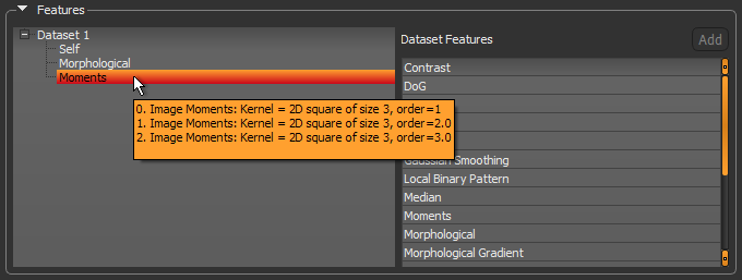 Whenever a feature preset is added to the features tree of the current classifier, a copy is made and saved with the model. You can then edit the copy without editing the default features preset. Dataset features presets must be added to a dataset, while region features must be added to a dataset feature. It is possible to preview dataset features and region features during the training workflow and prior to segmentation.