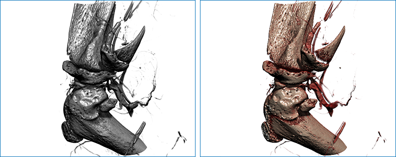 In the example below, the original grayscale LUT was edited so that bone and soft tissue are colored more realistically.