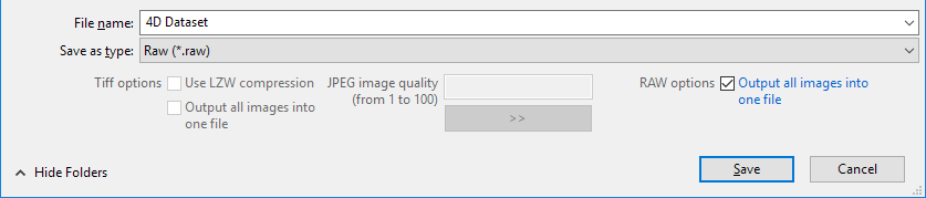 A basic file format that saves images or stacks as raw pixel data without a header. Suitable for transferring files between applications and computer platforms. When saving RAW files in Dragonfly, header information is saved in an accompanying DAT file. If you choose *.raw as the file format for your 4D data, you can select the Output all images into one file option as shown below. |