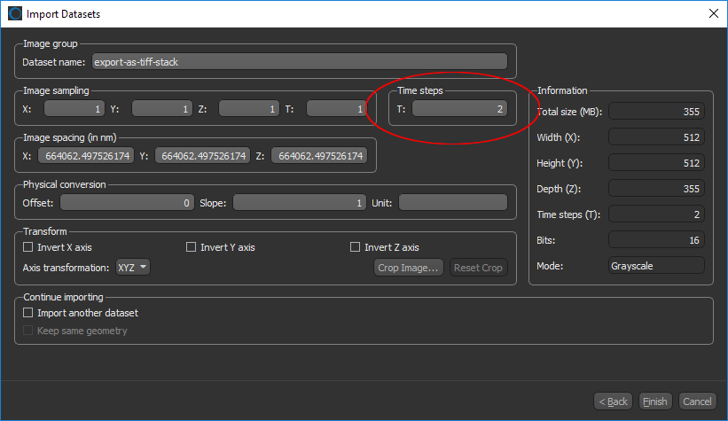 A widely supported lossless compression file format for storing bit-mapped images, TIFF files can be any resolution, as well as uncompressed or LZW compressed. The following options are available when saving data in the TIFF file format. Use LZW compression… If selected, the TIFF file or files will be compressed using LZW compression, a lossless data-compression technique for reducing a file's size created by Abraham Lempel, Jacob Ziv, and Terry Welch. Output all images into one file… This file format differs from an image stack in that the entire volume is stored in a single file. Although the majority of TIFFs contain just a single image stored in a directory, some applications can generate multi-directory TIFFs that contain multiple images. Note The number of time steps in the data are not be encoded in TIFF files. You will need to enter the number of time steps in the Import Datasets, shown below, if you load the data back into Dragonfly. |