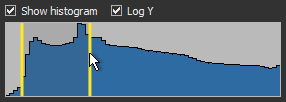 Shows how data values are distributed within the selected dataset. The darkest parts will appear on the left side of the graph, the midtones will appear in the middle, and the brightest parts (highlights) on the right side. Note You can adjust the range with left or right Range sliders (window width), as well as drag from the middle of the selected range to translate the range values (window center). |