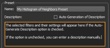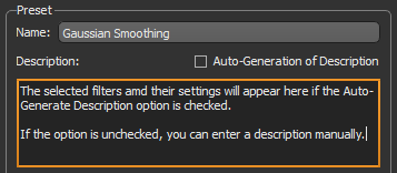 - Check the Auto-Generate Description option, recommended. If selected, a description based on the filters added to the preset, as well as their settings, will be created automatically.