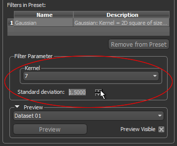 To preview filtering effects, select a dataset input in the drop-down menu and then click the Preview button.