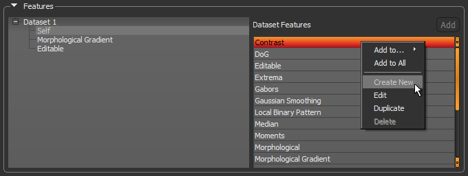 - Right-click inside the Dataset Features box and then choose Create New in the pop-up menu.