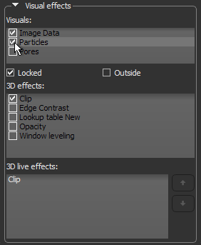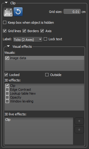 Lets you apply clipping to other objects visible in the current 3D view, as well as other visual effects (see Applying Visual Effects to Clips and Shapes). Note Visual effects such as clipping can be applied either to the inside or outside of a Clip box. Check the Outside option to apply the effect to the data of selected visuals that is exterior to the Clip box. Leave the Outside option unchecked to apply the effect to the data of selected visuals inside the Clip box. |