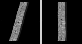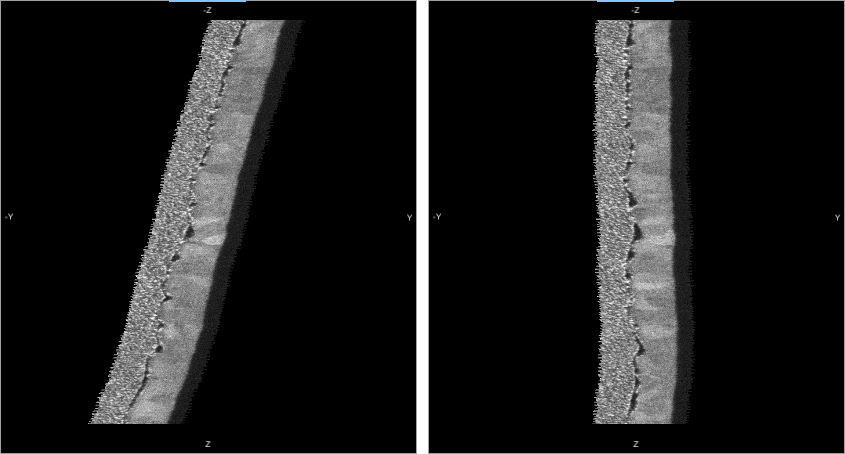 In some cases, you may notice that an unwanted drift has occurred after automatically aligning an image stack. For example, after applying the mutual information algorithm. To remedy such occurrences, Dragonfly provides the option to apply a linear displacement compensation after an automatic registration has been applied to an image stack. The results of registration before (on the left) and after (on the right) linear displacement compensation are shown below. Note The applied compensation factor is selectable with the Compensation Factor slider. |