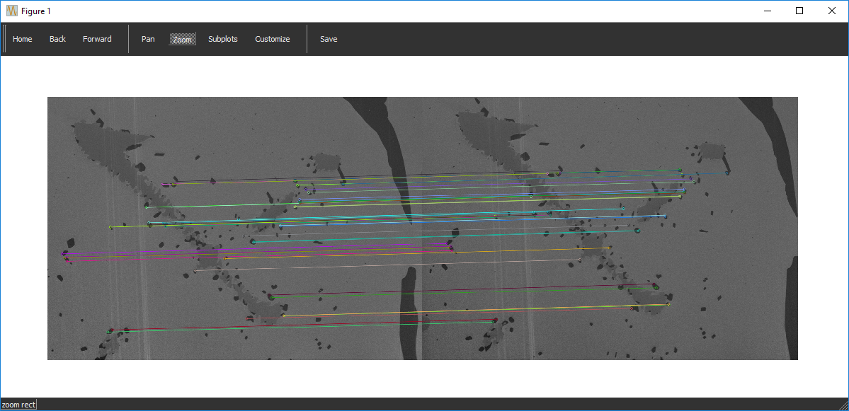 The preview for Feature Base comparisons, shown below, stacks two images horizontally and draws lines from the first image (the currently displayed slice in the workspace) to the next slice in the image stack and shows the best matches for the total number of features requested for the preview. In cases in which you notice mismatches, you may have to reduce Epsilon. You should also note that working with selected ranges can also help optimize your results. Number of Features… Lets you specify the maximum number of corners to return for the preview. If there are more corners than requested, the strongest matches will be returned. |
