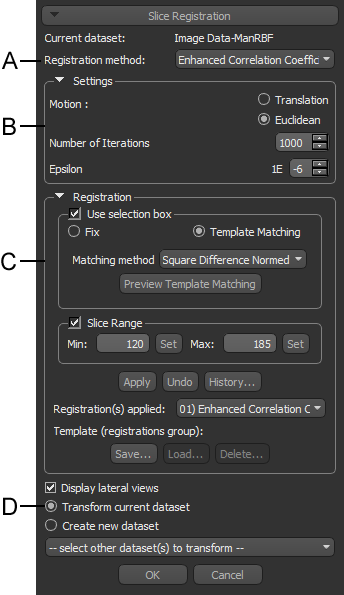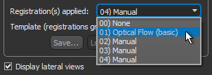 You can select a matching process for aligning slices automatically, a compensation method to correct unwanted drift, or choose to work in manual mode in the Registration method drop-down menu.