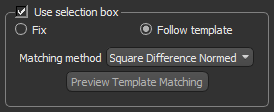 If selected, calculations for the required transformations will be constrained to the 2D region defined by the selection box (X and Y axes only). Two options are available for the selection box — Fixed and Follow template. Fixed… If selected, the selection box will not move during the registration process. Follow template… If selected, the selection box will search for and find the location of the template image in the larger images in the stack. You can select the matching method that will be used to compare and match the template with each input image (see Template Matching Settings).
