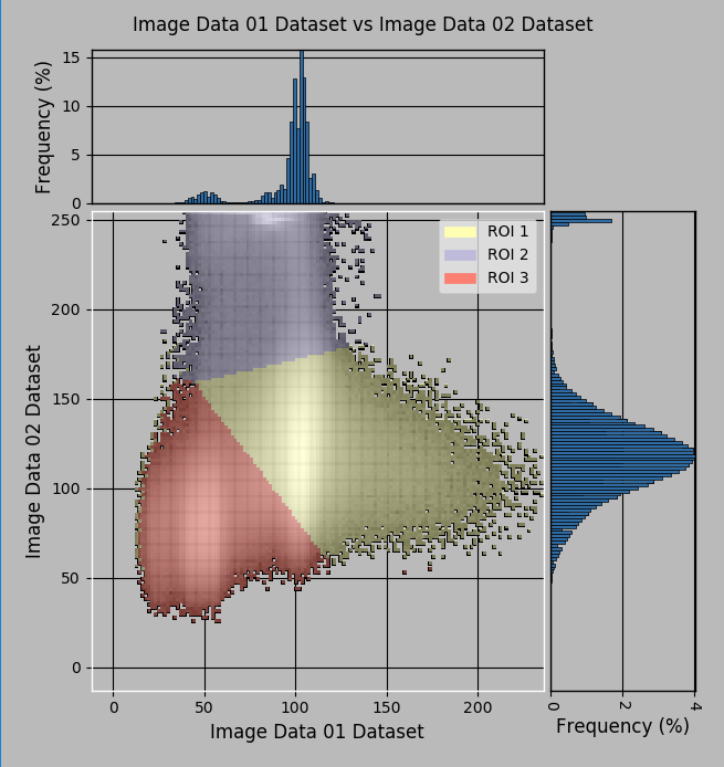 For plotting in the Histographic Segmentation dialog, selected datasets must of the same size and type, but can be from different modalities. In addition, the Sobel of dataset selected for X axis will be available automatically for plotting on the Y axis. You can also select a mask to restrict processing to a subset of the data.