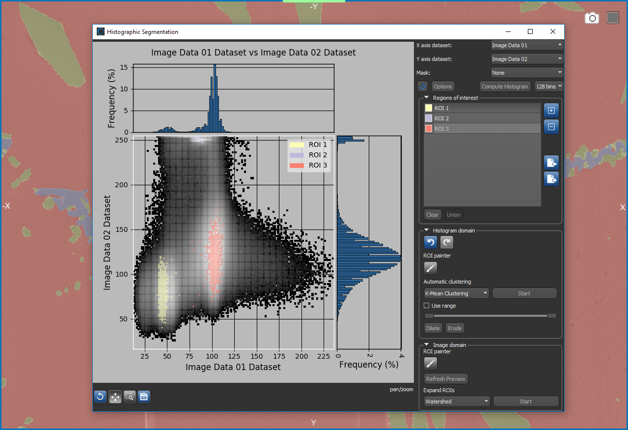 Histographic segmentation offers the opportunity to interact with multiple datasets mapped on a two-dimensional histogram and to distinguish features of interest and then select clustered data values to create regions of interest. With this tool, you can quickly segment a dataset by selecting clustered data values, which will be propagated to all data points that meet the selection criteria. Regions of interest created in this manner can either be exported or expanded through a Watershed algorithm to fully segment the selected dataset.