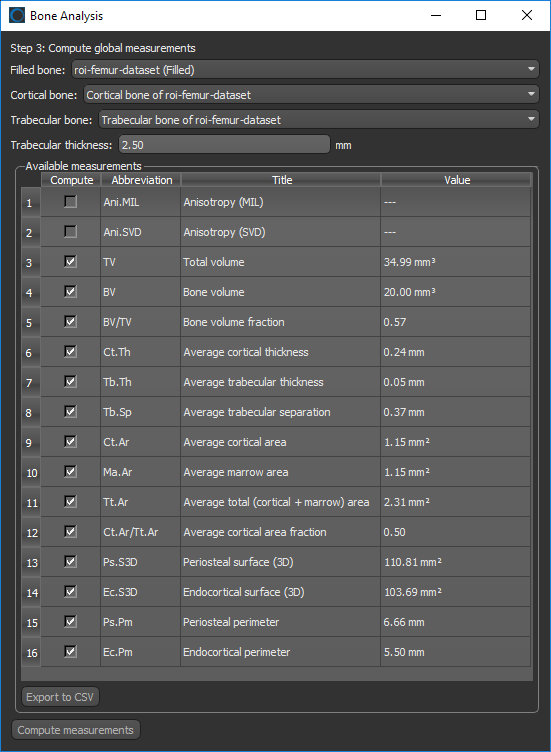 Global measurements of cortical and trabecular indices (see Computing Global Measurements) are available directly in the Bone Analysis dialog, shown below. Computed results can be exported in comma-separated values files (*.csv extension).