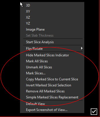 The options for marking image slices are available in the 2D view pop-up menu, shown below.