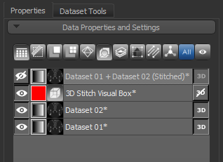 - Select all of the datasets you plan to stitch in the Data Properties and Settings panel, right click, and then choose Stitch 3D Images in the pop-up menu.