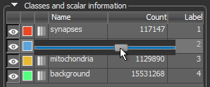 The Classes and scalar information box, shown below, indicates the name of each class in the multi-ROI, the number of labeled voxels, and the color assigned to each class. If available, you can also view scalar information related to each class. You can show or hide any class by toggling the visibility control, as well as set a class as the background. In addition, a Pick tool is available for visually selecting a class in a view.