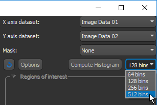Histographic segmentation offers the opportunity to interact with multiple datasets mapped on a two-dimensional histogram and to distinguish features of interest and then select clustered data values to create regions of interest. With this tool, you can quickly segment a dataset by selecting clustered data values, which will be propagated to all data points that meet the selection criteria. Regions of interest created in this manner can either be exported or expanded through a Watershed algorithm to fully segment the selected dataset.