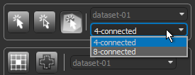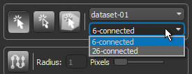 Lets you choose a level of connectivity, which determines how pixels in 2D images and voxels in 3D images relate to their neighbors. When working in Single-slice mode in 2D views, connectivity is selectable as follows: 4-connected… Propagation is done by strictly using the 4 edges adjacent to the current seed and will result in the minimum number of connected pixels. 8-connected… Propagation is done by strictly using the 4 edges and 4 corners adjacent to the current seed and will result in the maximum number of connected pixels. When working in Multi-slice mode in 2D views and in 3D views, connectivity is selectable as follows: 6-connected… Propagation is done by strictly using the 6 faces adjacent to the current seed and will result in the minimum number of connected voxels. 26-connected… Propagation is done by strictly using the 6 faces, 8 corners, and 12 edges adjacent to the current seed and will result in the maximum number of connected voxels. |