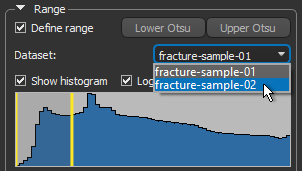 Automatically sets the range between the Otsu threshold and the maximum data value in the selected dataset.