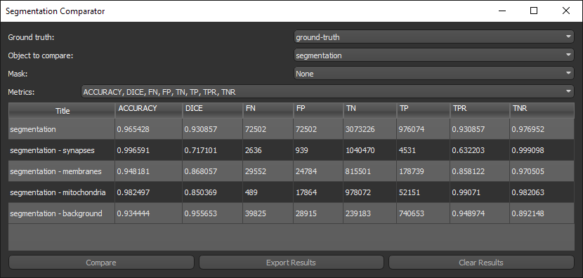 You can use the Segmentation Comparator to compare an automated segmentation with a ground truth and objectively evaluate the results with a number of metrics, such as Accuracy, Dice, True Positive Rate, True Negative Rate, and others. Results can be exported in the comma-separated values (*.csv extension) file format for further analysis or archiving.