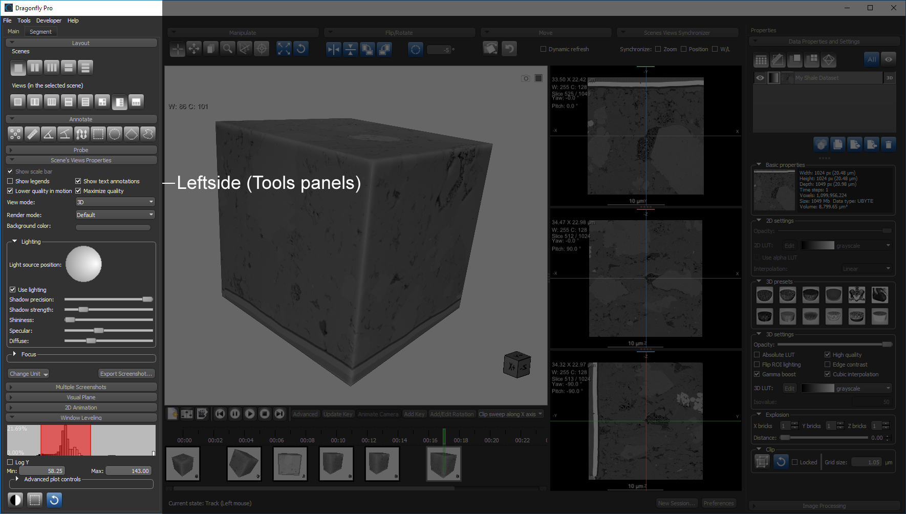 Left… The left side of the Dragonfly interface is the default location for different tool panels, such as Layout, Annotate, Scene's Views Properties, and Window Leveling (see Tool Panels), as well as tools used for segmentation tasks (see Segment Tools).