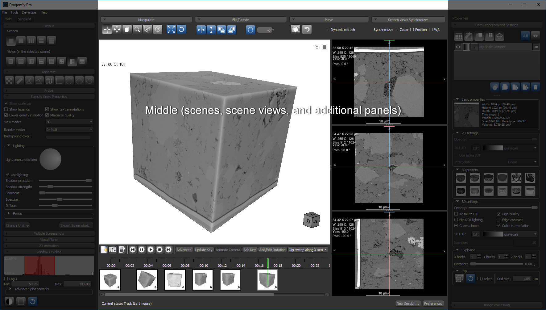 Middle… The large middle section of the Dragonfly interface contains the scenes in which image files, meshes, regions of interest, and other objects can be displayed (see Scenes and Views).